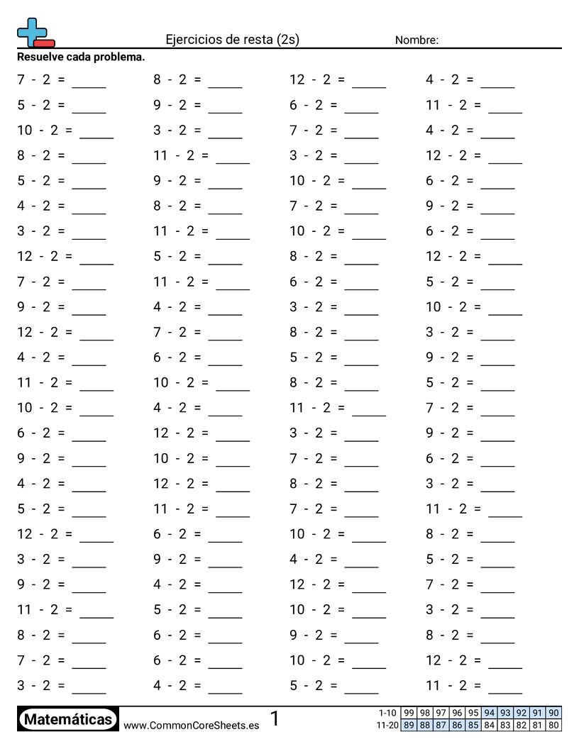 Hojas de trabajo gratis de math sobre Ejercicios de resta (2s) . Cada hoja tiene 100 ejercicios con hoja de respuestas y es ideal para maestros y educación en casa. Puedes descargar el PDF, crear tarjetas de memoria o configurarlo para aprendizaje en línea.