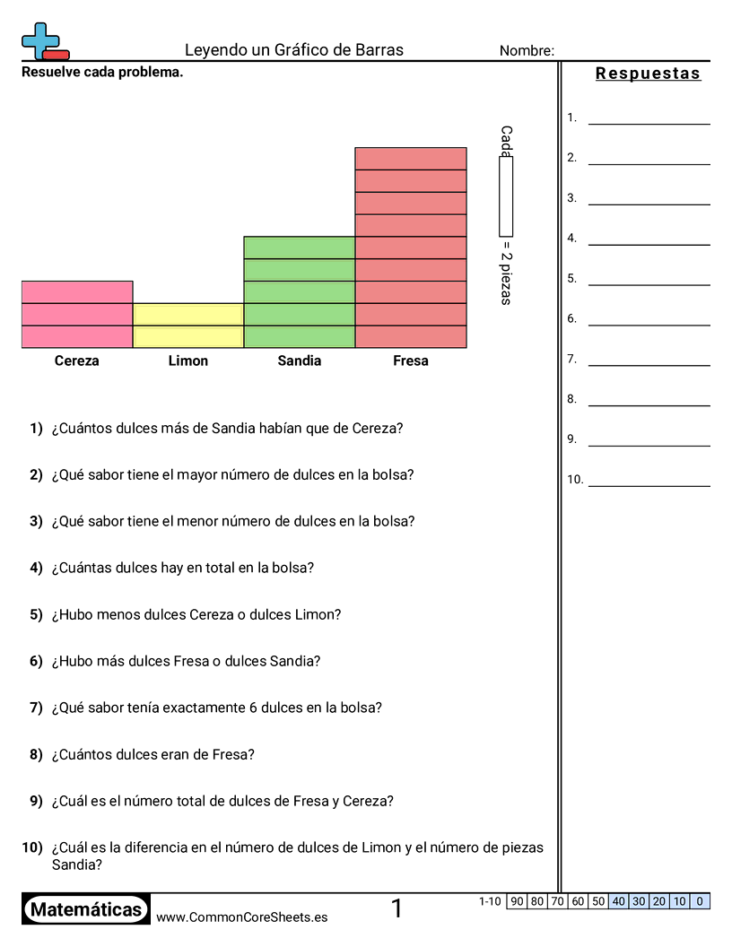 Hojas de trabajo gratis de math para 2do Grado (2md10) sobre Leyendo un Gráfico de Barras. Cada hoja tiene 10 ejercicios con hoja de respuestas y es ideal para maestros y educación en casa. Puedes descargar el PDF, crear tarjetas de memoria o configurarlo para aprendizaje en línea.