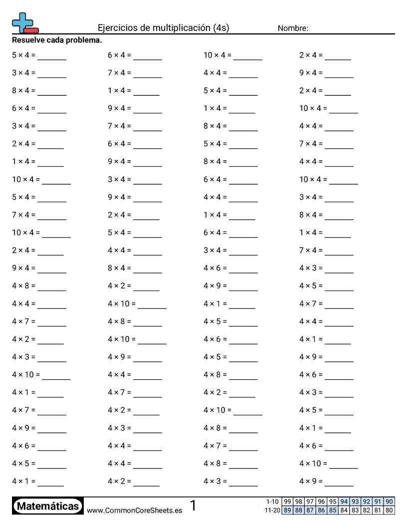 Hojas de trabajo gratis de math sobre Ejercicios de multiplicación (4s) . Cada hoja tiene 100 ejercicios con hoja de respuestas y es ideal para maestros y educación en casa. Puedes descargar el PDF, crear tarjetas de memoria o configurarlo para aprendizaje en línea.