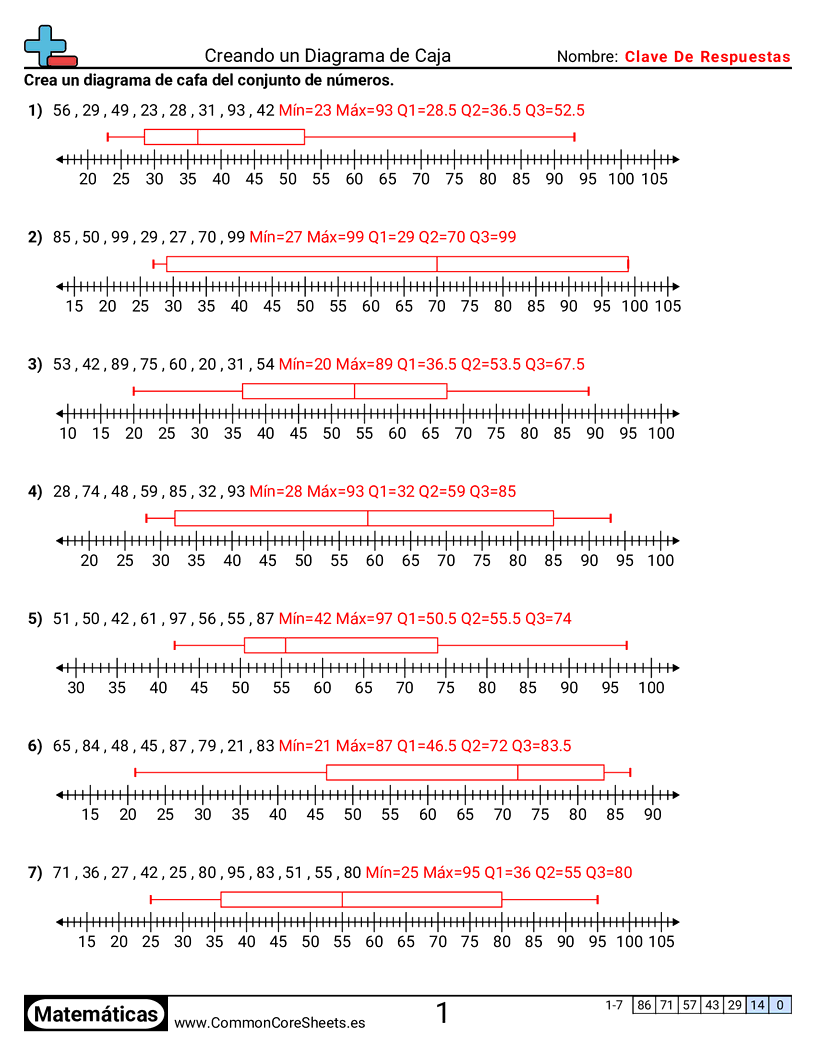 Cada hoja tiene 7 problemas para crear un diagrama de caja a partir de un conjunto de números.