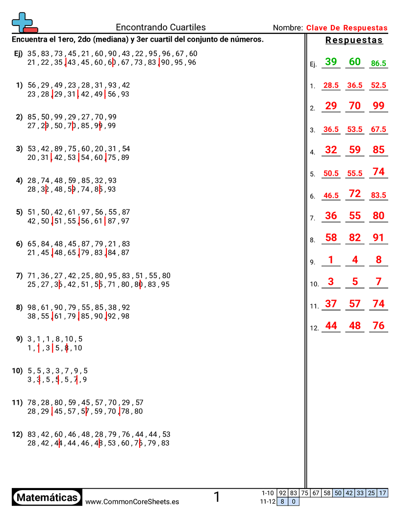 Cada hoja tiene 12 problemas dividiendo un conjunto de números en cuartiles.