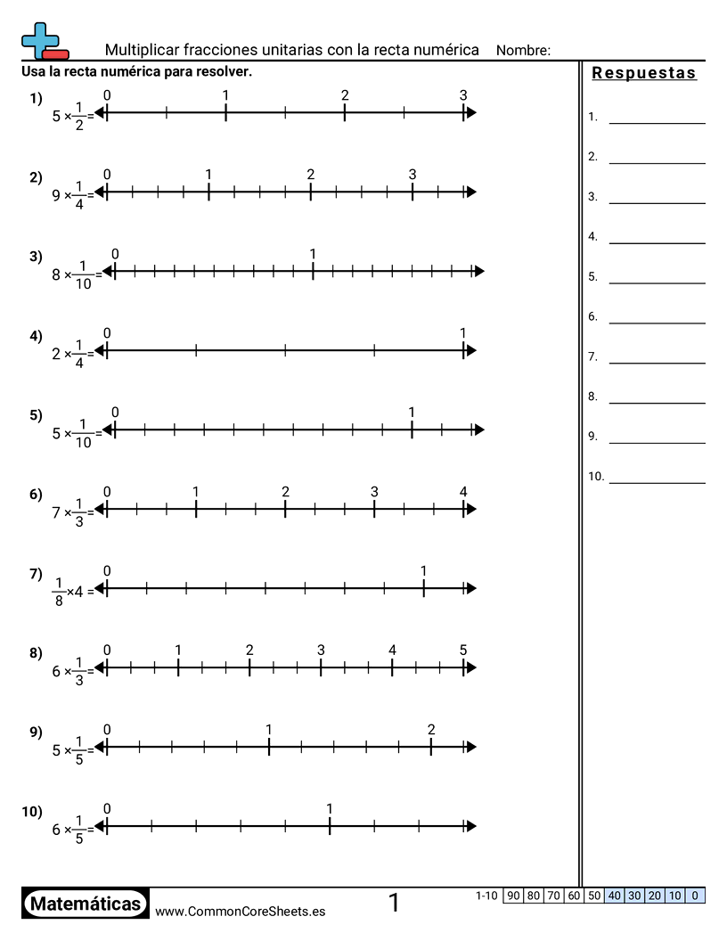 Hojas de trabajo gratis de math para 4to Grado (4nf4a) sobre Multiplicar fracciones unitarias con la recta numérica. Cada hoja tiene 10 ejercicios con hoja de respuestas y es ideal para maestros y educación en casa. Puedes descargar el PDF, crear tarjetas de memoria o configurarlo para aprendizaje en línea.