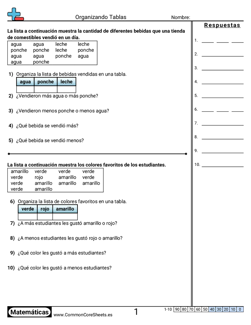 Hojas de trabajo gratis de math para 1er Grado (1md4) sobre Organizando Tablas. Cada hoja tiene 10 ejercicios con hoja de respuestas y es ideal para maestros y educación en casa. Puedes descargar el PDF, crear tarjetas de memoria o configurarlo para aprendizaje en línea.
