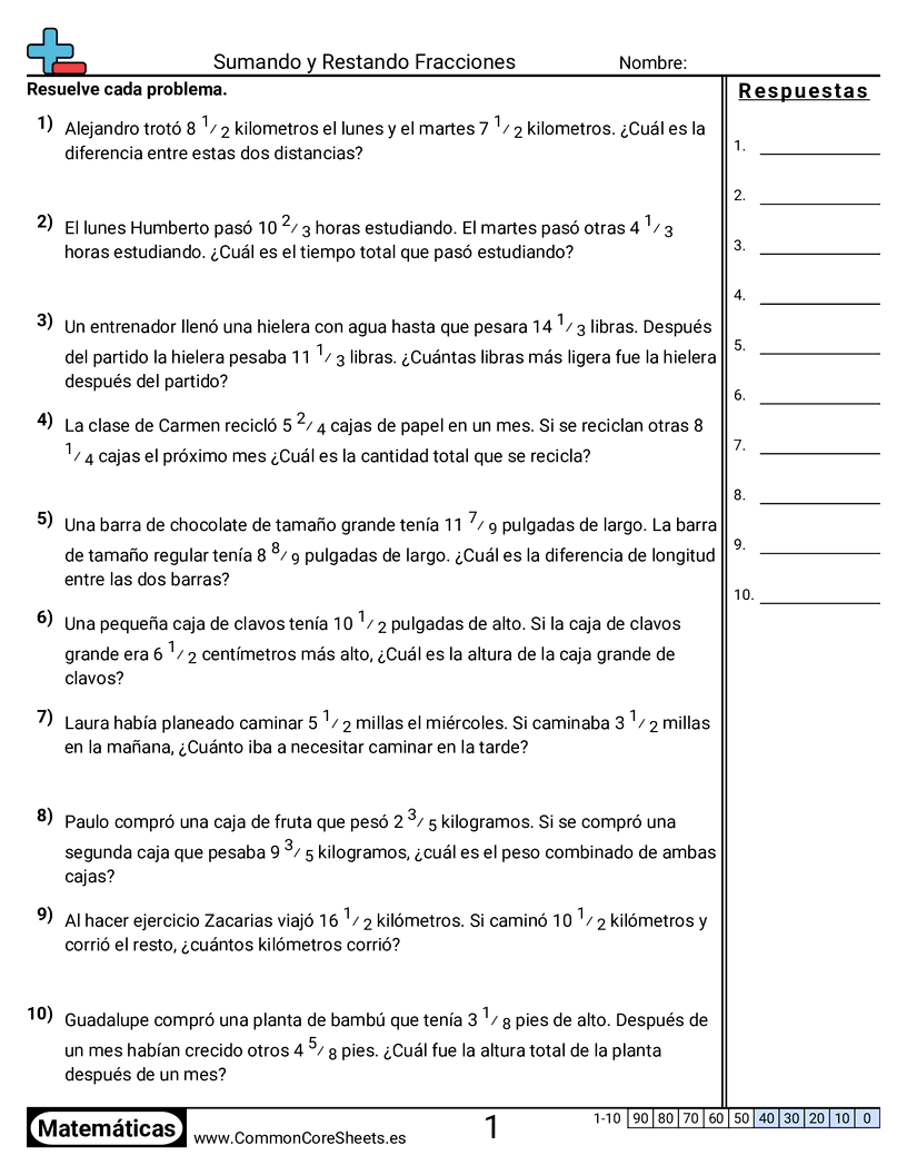 Hojas de trabajo gratis de math para 4to Grado (4nf3d) sobre Sumando y Restando Fracciones. Cada hoja tiene 10 ejercicios con hoja de respuestas y es ideal para maestros y educación en casa. Puedes descargar el PDF, crear tarjetas de memoria o configurarlo para aprendizaje en línea.
