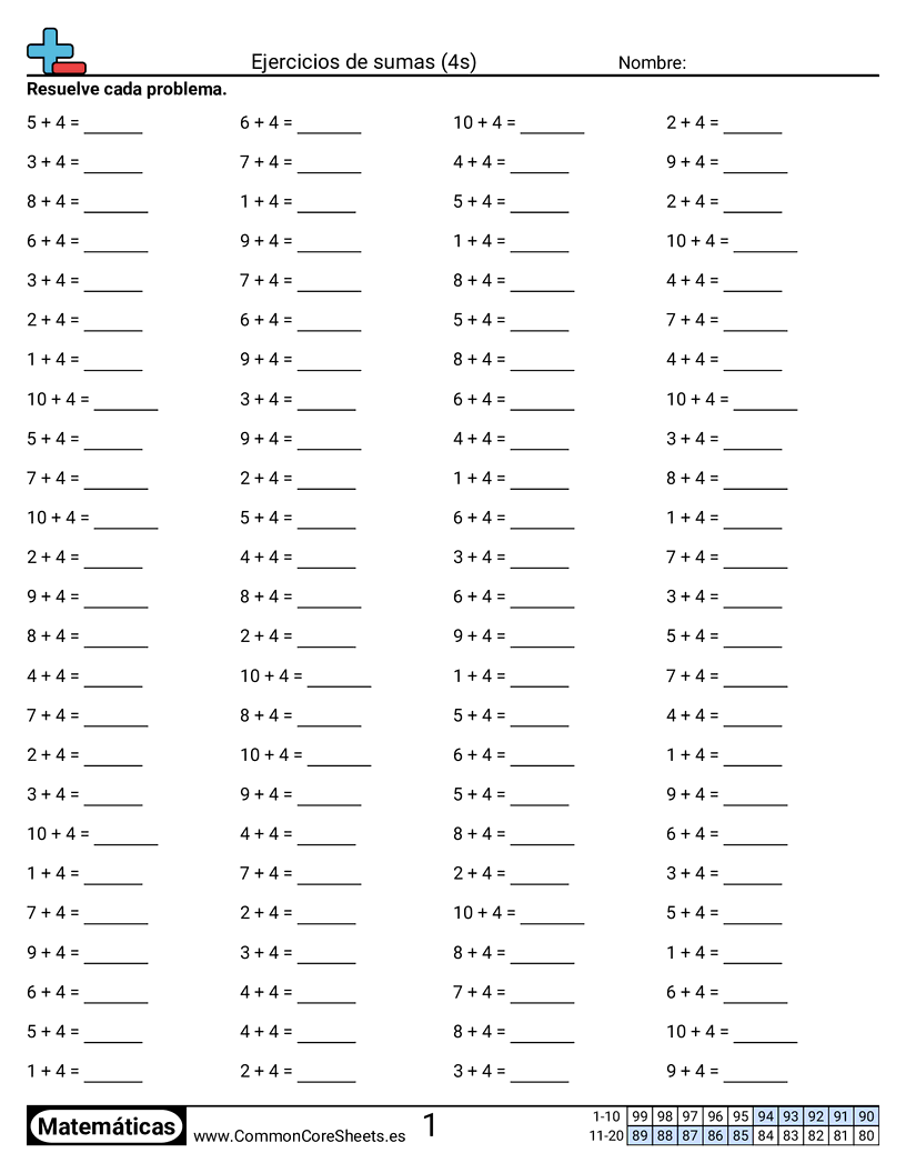 Hojas de trabajo gratis de math sobre Ejercicios de sumas (4s) . Cada hoja tiene 100 ejercicios con hoja de respuestas y es ideal para maestros y educación en casa. Puedes descargar el PDF, crear tarjetas de memoria o configurarlo para aprendizaje en línea.