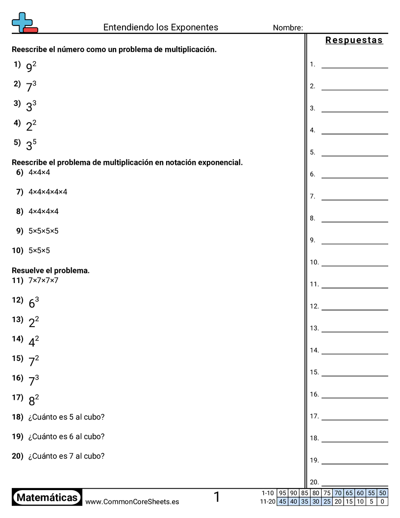 Cada hoja tiene 20 problemas que introducen exponentes.