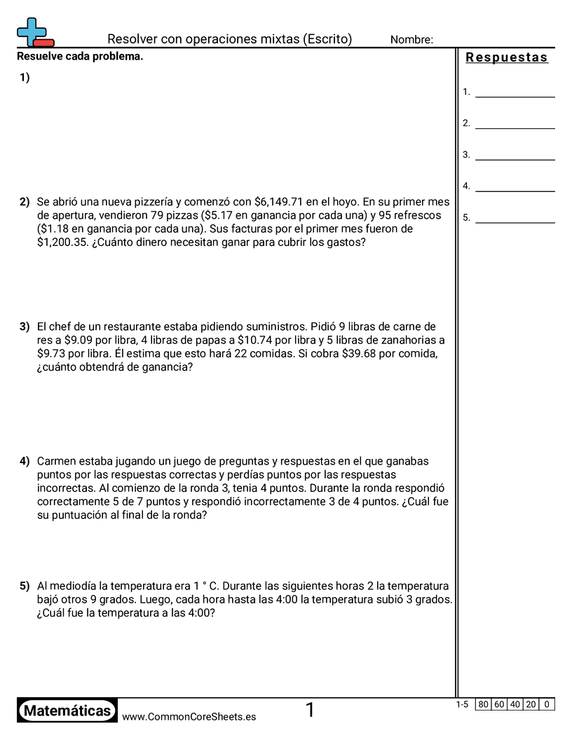 Hojas de trabajo gratis de math para 7mo Grado (7ns3) sobre Resolver con operaciones mixtas (Escrito). Cada hoja tiene 5 ejercicios con hoja de respuestas y es ideal para maestros y educación en casa. Puedes descargar el PDF, crear tarjetas de memoria o configurarlo para aprendizaje en línea.