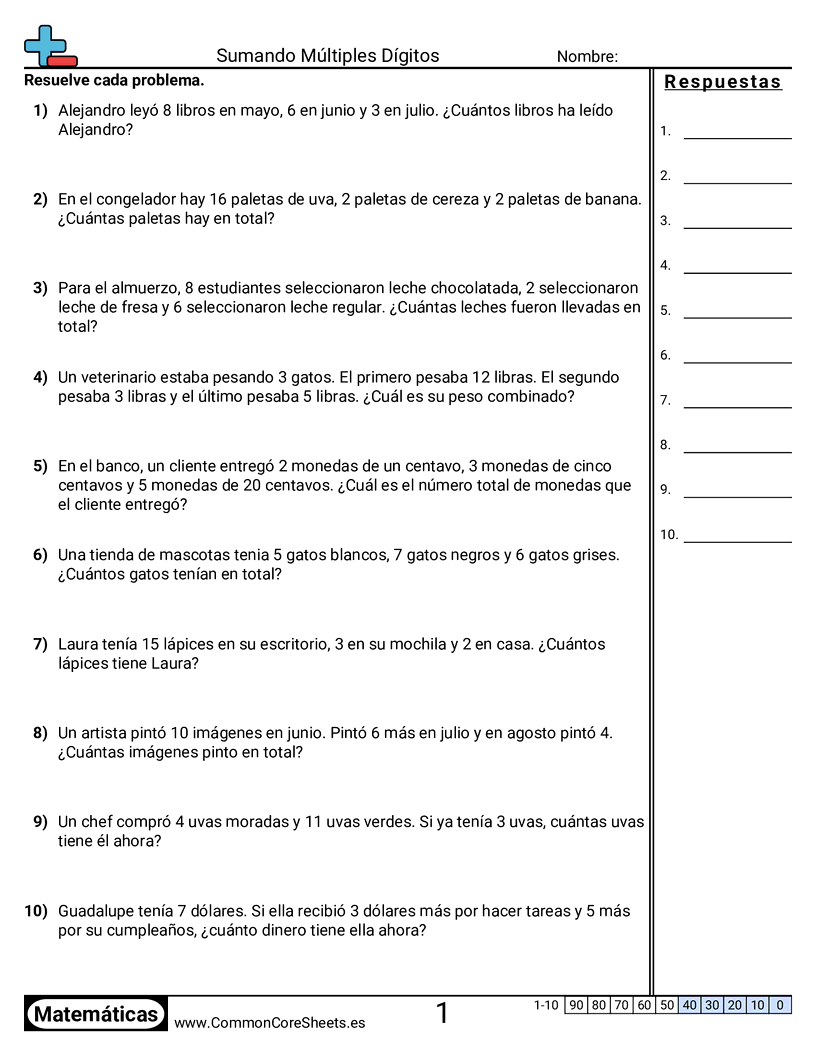 Hojas de trabajo gratis de math para 1er Grado (1oa2) sobre Sumando Múltiples Dígitos. Cada hoja tiene 10 ejercicios con hoja de respuestas y es ideal para maestros y educación en casa. Puedes descargar el PDF, crear tarjetas de memoria o configurarlo para aprendizaje en línea.
