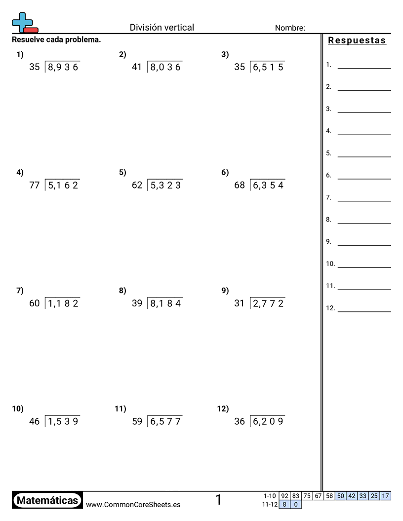Hojas de trabajo gratis de math para 5to Grado (5nbt6) sobre División vertical. Cada hoja tiene 12 ejercicios con hoja de respuestas y es ideal para maestros y educación en casa. Puedes descargar el PDF, crear tarjetas de memoria o configurarlo para aprendizaje en línea.