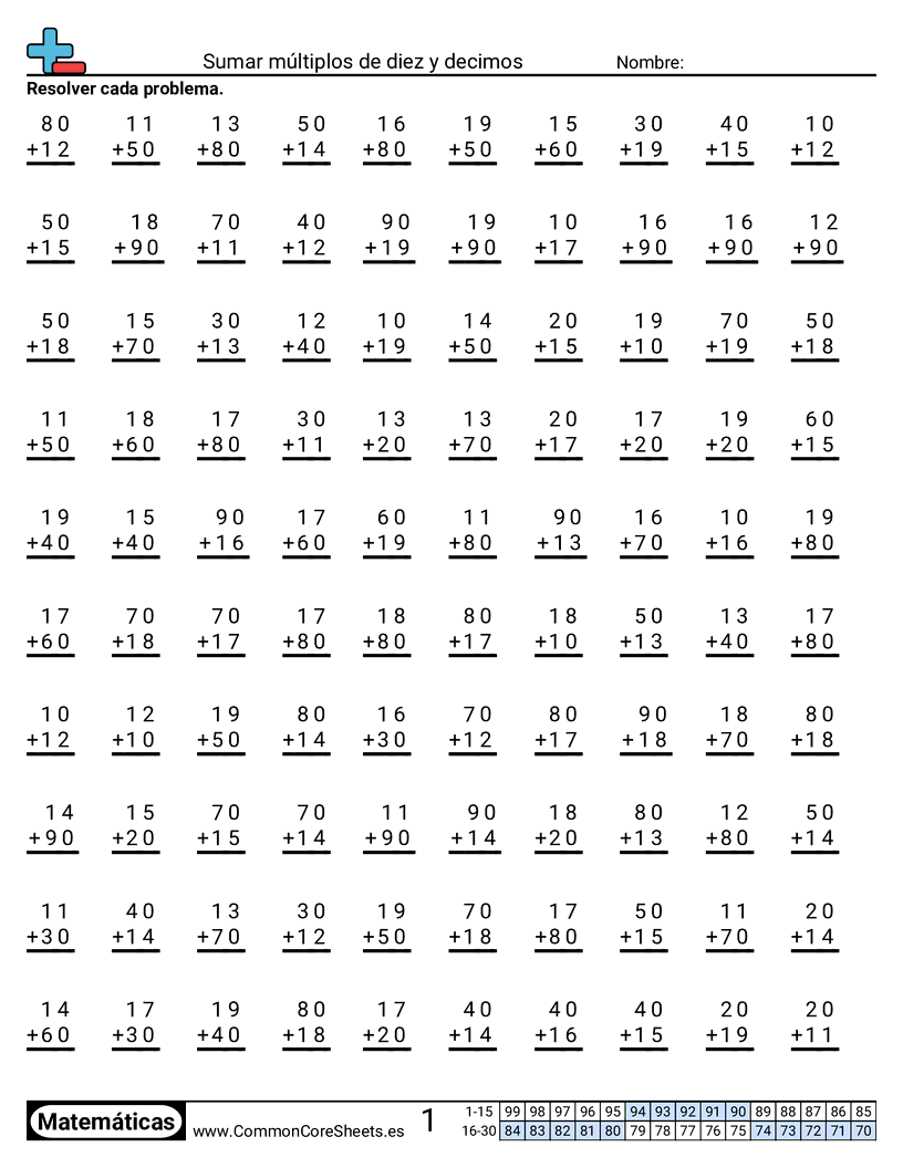 Hojas de trabajo gratis de math sobre Sumar múltiplos de diez y decimos. Cada hoja tiene 100 ejercicios con hoja de respuestas y es ideal para maestros y educación en casa. Puedes descargar el PDF, crear tarjetas de memoria o configurarlo para aprendizaje en línea.
