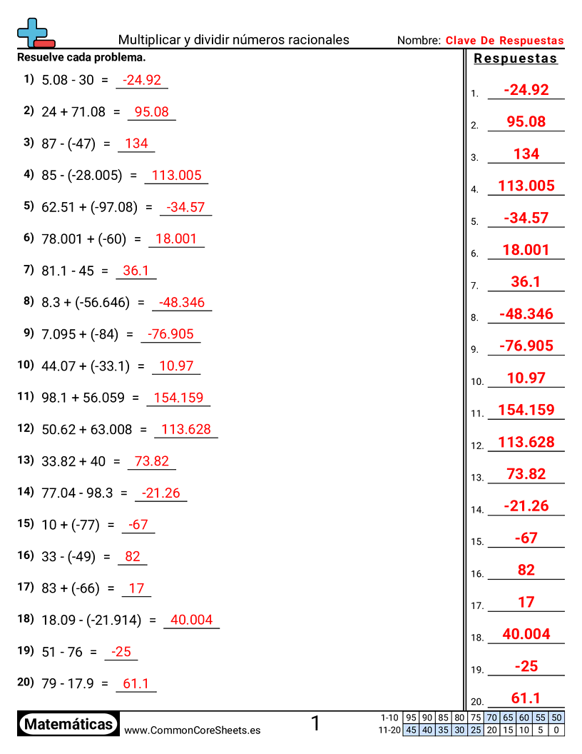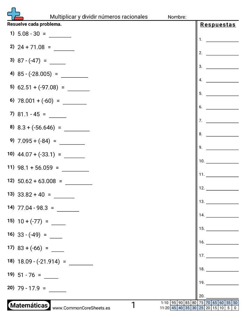 Hojas de trabajo gratis de math para 7mo Grado (7ns1d) sobre Multiplicar y dividir números racionales. Cada hoja tiene 20 ejercicios con hoja de respuestas y es ideal para maestros y educación en casa. Puedes descargar el PDF, crear tarjetas de memoria o configurarlo para aprendizaje en línea.