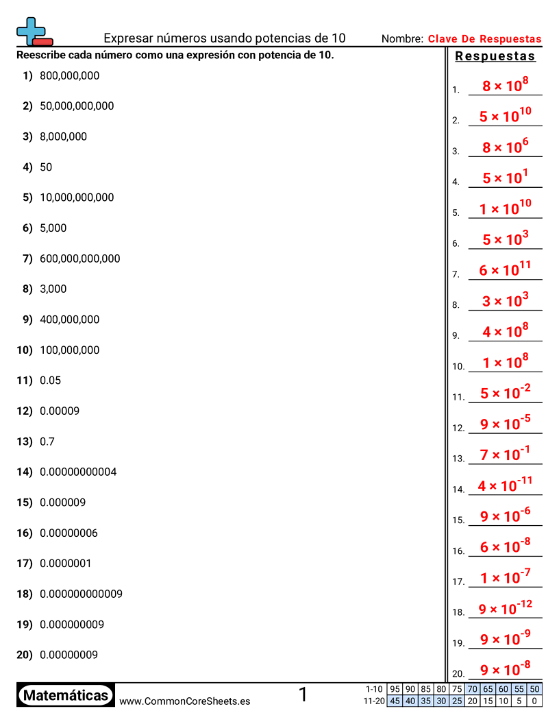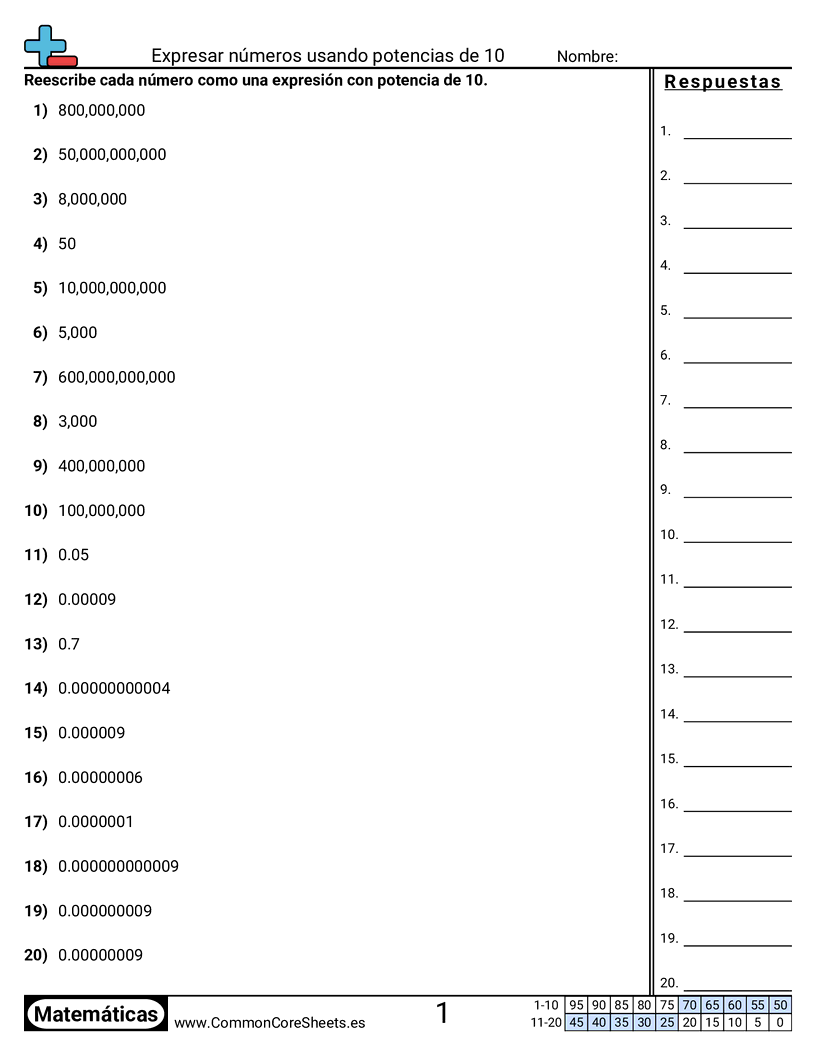 Hojas de trabajo gratis de math para 8vo Grado (8ee3) sobre Expresar números usando potencias de 10. Cada hoja tiene 20 ejercicios con hoja de respuestas y es ideal para maestros y educación en casa. Puedes descargar el PDF, crear tarjetas de memoria o configurarlo para aprendizaje en línea.
