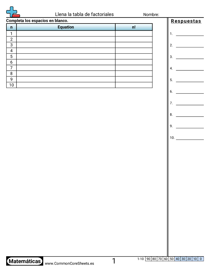 Hojas de trabajo gratis de math sobre Llena la tabla de factoriales. Cada hoja tiene 10 ejercicios con hoja de respuestas y es ideal para maestros y educación en casa. Puedes descargar el PDF, crear tarjetas de memoria o configurarlo para aprendizaje en línea.