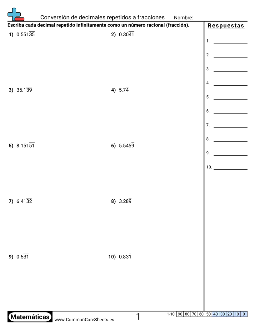 Hojas de trabajo gratis de math para 8vo Grado (8ns1) sobre Conversión de decimales repetidos a fracciones. Cada hoja tiene 10 ejercicios con hoja de respuestas y es ideal para maestros y educación en casa. Puedes descargar el PDF, crear tarjetas de memoria o configurarlo para aprendizaje en línea.