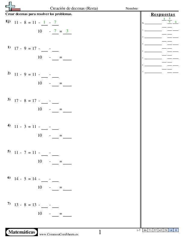 Cada hoja contiene 7 problemas deshaciendo un problema de resta en un problema de resta con diez .