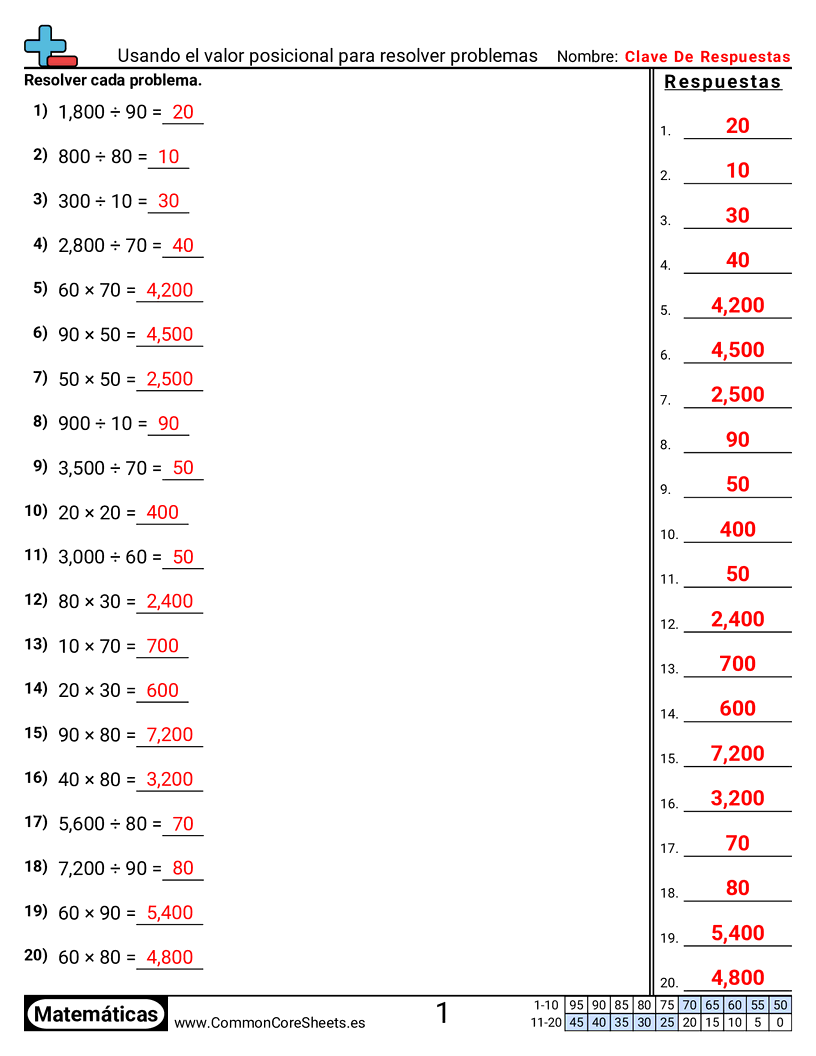Cada hoja tiene 20 problemas para usar el valor posicional para encontrar la respuesta a los problemas de multiplicación y división.
