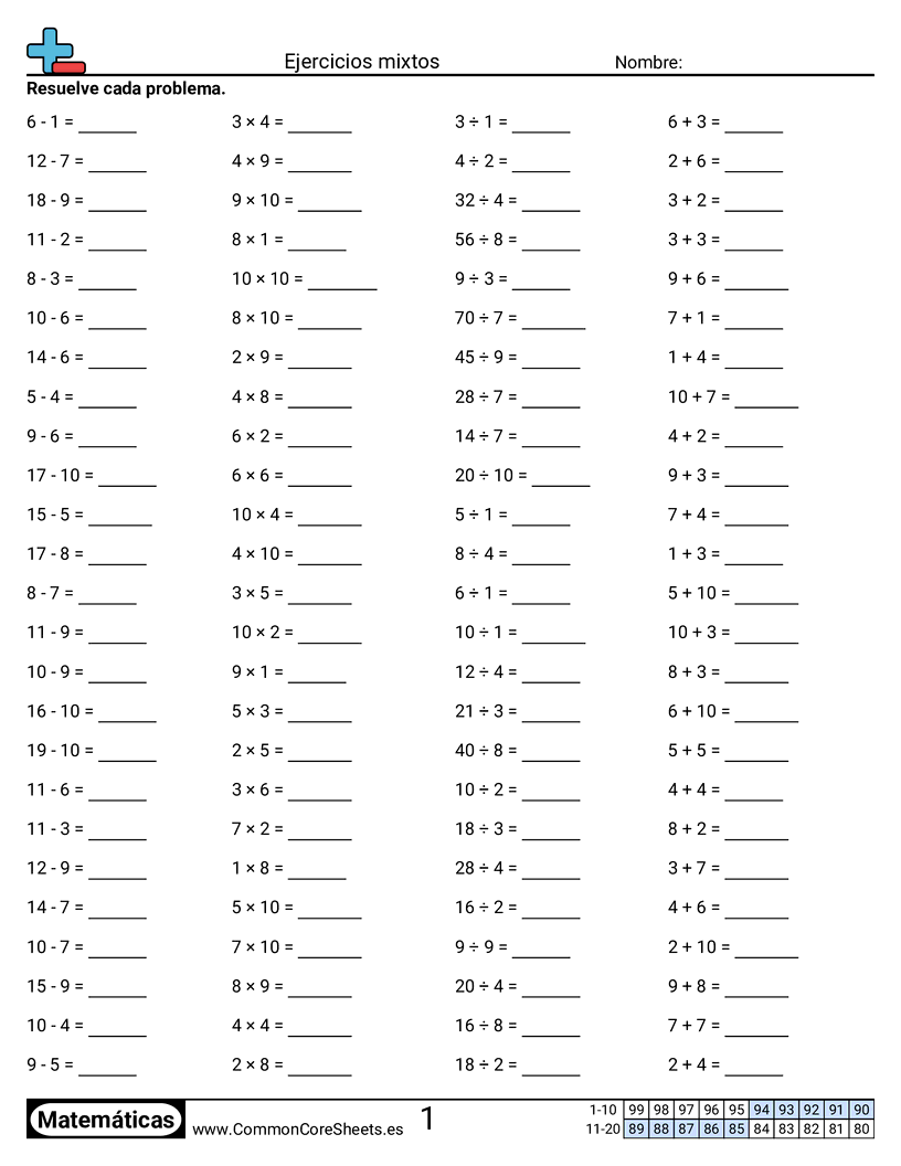 Hojas de trabajo gratis de math sobre Ejercicios mixtos. Cada hoja tiene 100 ejercicios con hoja de respuestas y es ideal para maestros y educación en casa. Puedes descargar el PDF, crear tarjetas de memoria o configurarlo para aprendizaje en línea.