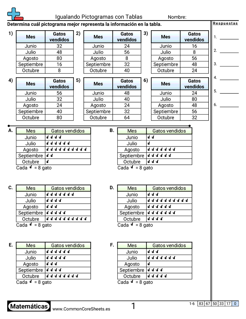 Hojas de trabajo gratis de math para 2do Grado (2md10) sobre Igualando Pictogramas con Tablas. Cada hoja tiene 6 ejercicios con hoja de respuestas y es ideal para maestros y educación en casa. Puedes descargar el PDF, crear tarjetas de memoria o configurarlo para aprendizaje en línea.