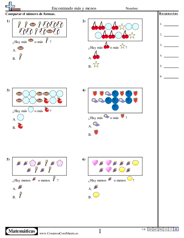 Cada hoja tiene 6 problemas para comparar hasta 3 objetos.