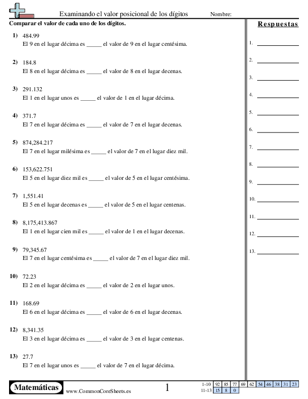 Cada hoja tiene 13 problemas que determinan los valores de dígitos basados en la posición de valor.