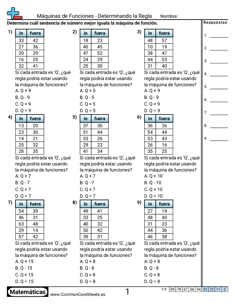 Hojas de trabajo gratis de math sobre Máquinas de Funciones - Determinando la Regla. Cada hoja tiene 9 ejercicios con hoja de respuestas y es ideal para maestros y educación en casa. Puedes descargar el PDF, crear tarjetas de memoria o configurarlo para aprendizaje en línea.