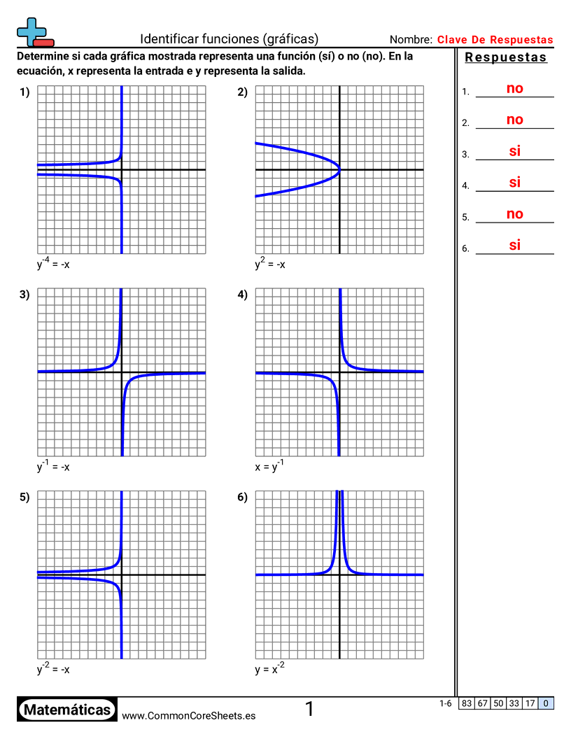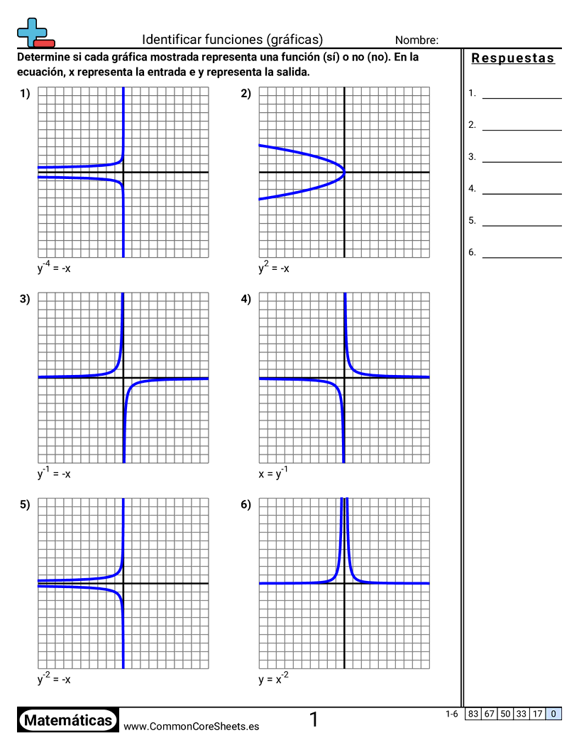 Hojas de trabajo gratis de math para 8vo Grado (8f1) sobre Identificar funciones (gráficas). Cada hoja tiene 6 ejercicios con hoja de respuestas y es ideal para maestros y educación en casa. Puedes descargar el PDF, crear tarjetas de memoria o configurarlo para aprendizaje en línea.
