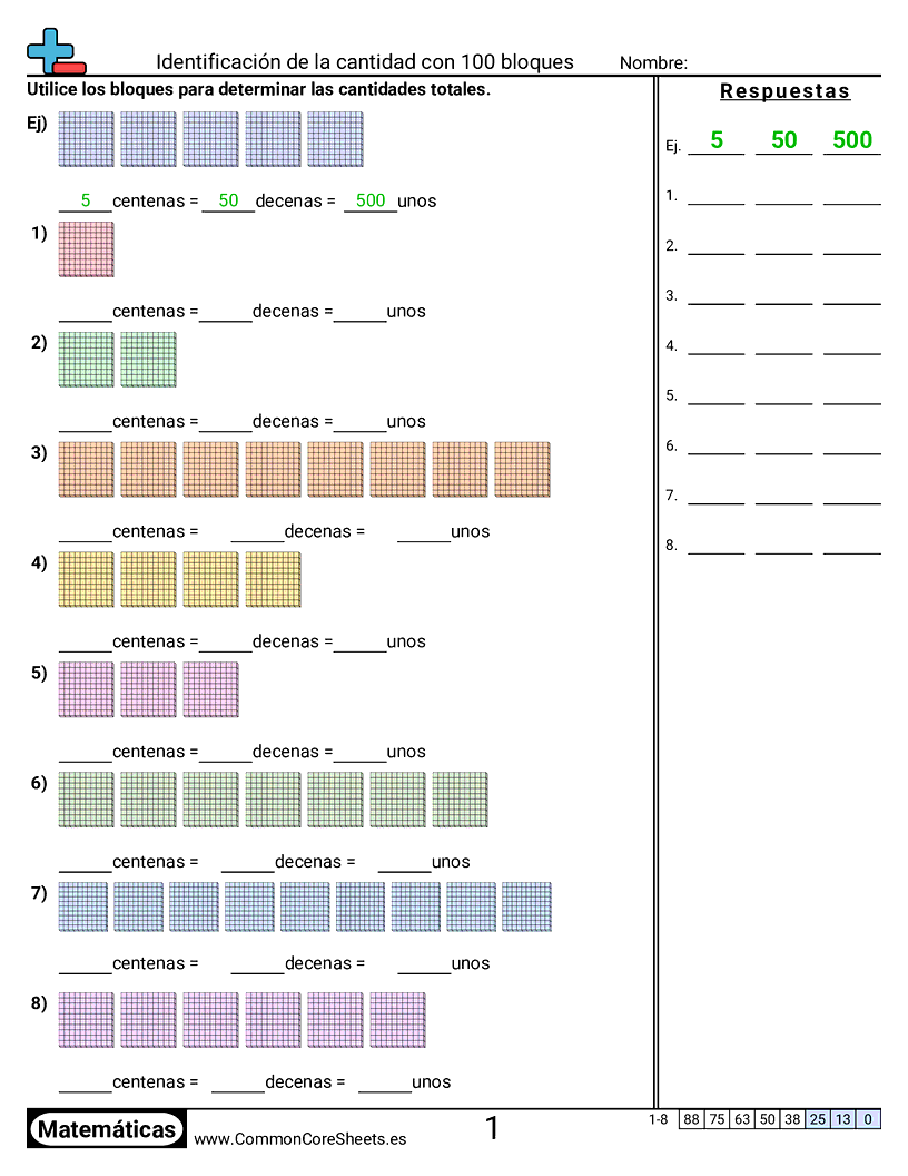 Hojas de trabajo gratis de math para 2do Grado (2nbt1a) sobre Identificación de la cantidad con 100 bloques. Cada hoja tiene 8 ejercicios con hoja de respuestas y es ideal para maestros y educación en casa. Puedes descargar el PDF, crear tarjetas de memoria o configurarlo para aprendizaje en línea.