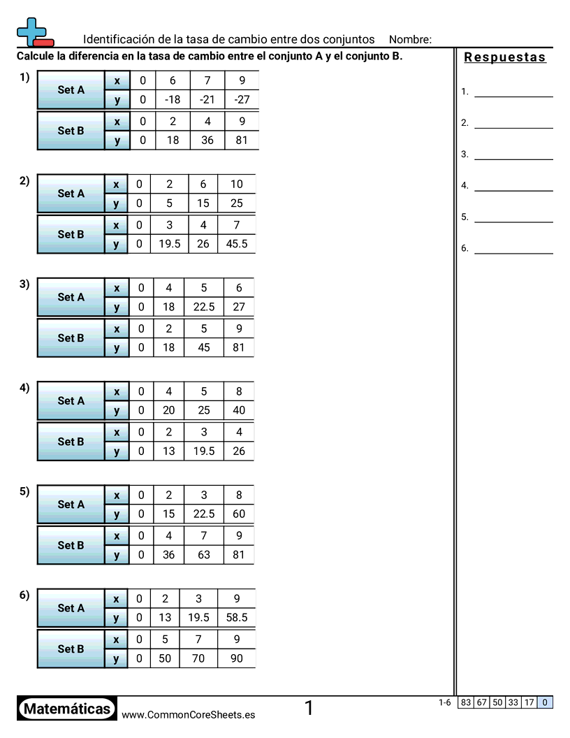 Hojas de trabajo gratis de math para 8vo Grado (8ee5) sobre Identificación de la tasa de cambio entre dos conjuntos. Cada hoja tiene 6 ejercicios con hoja de respuestas y es ideal para maestros y educación en casa. Puedes descargar el PDF, crear tarjetas de memoria o configurarlo para aprendizaje en línea.