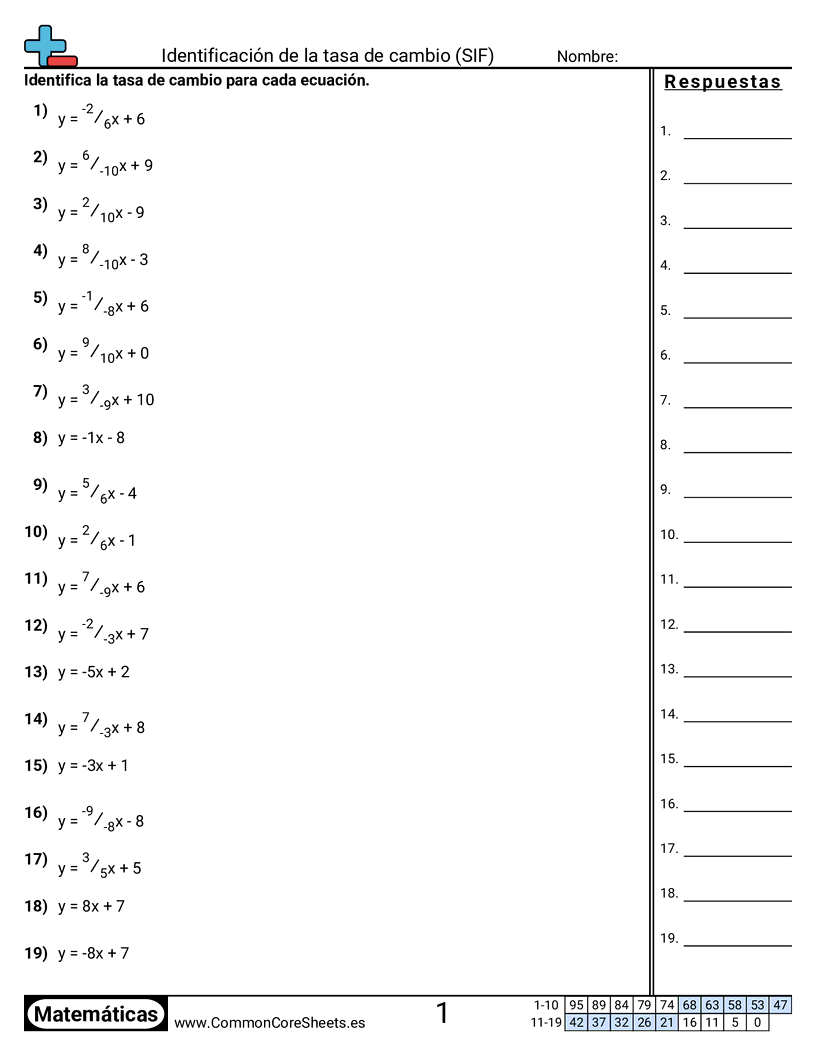 Hojas de trabajo gratis de math para 8vo Grado (8f2) sobre Identificación de la tasa de cambio (SIF). Cada hoja tiene 19 ejercicios con hoja de respuestas y es ideal para maestros y educación en casa. Puedes descargar el PDF, crear tarjetas de memoria o configurarlo para aprendizaje en línea.
