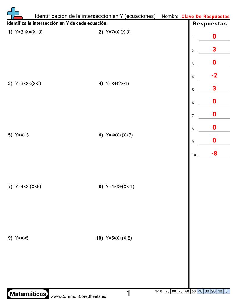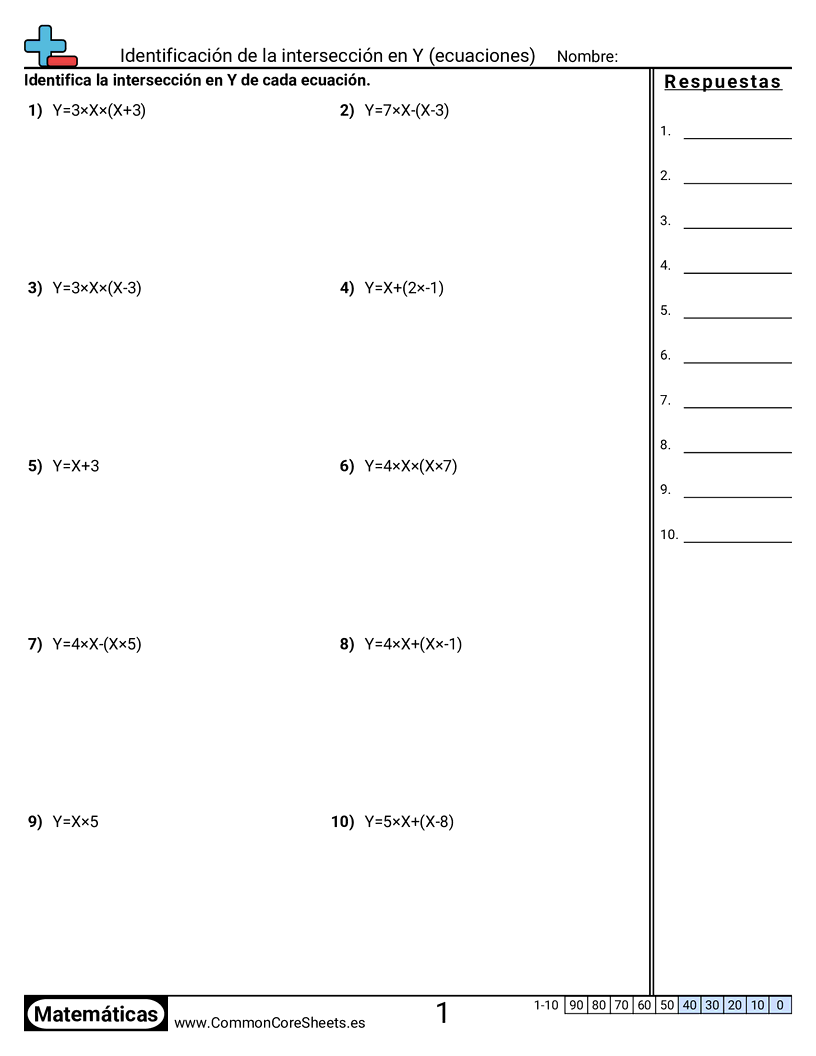 Hojas de trabajo gratis de math para 8vo Grado (8f2) sobre Identificación de la intersección en Y (ecuaciones). Cada hoja tiene 10 ejercicios con hoja de respuestas y es ideal para maestros y educación en casa. Puedes descargar el PDF, crear tarjetas de memoria o configurarlo para aprendizaje en línea.