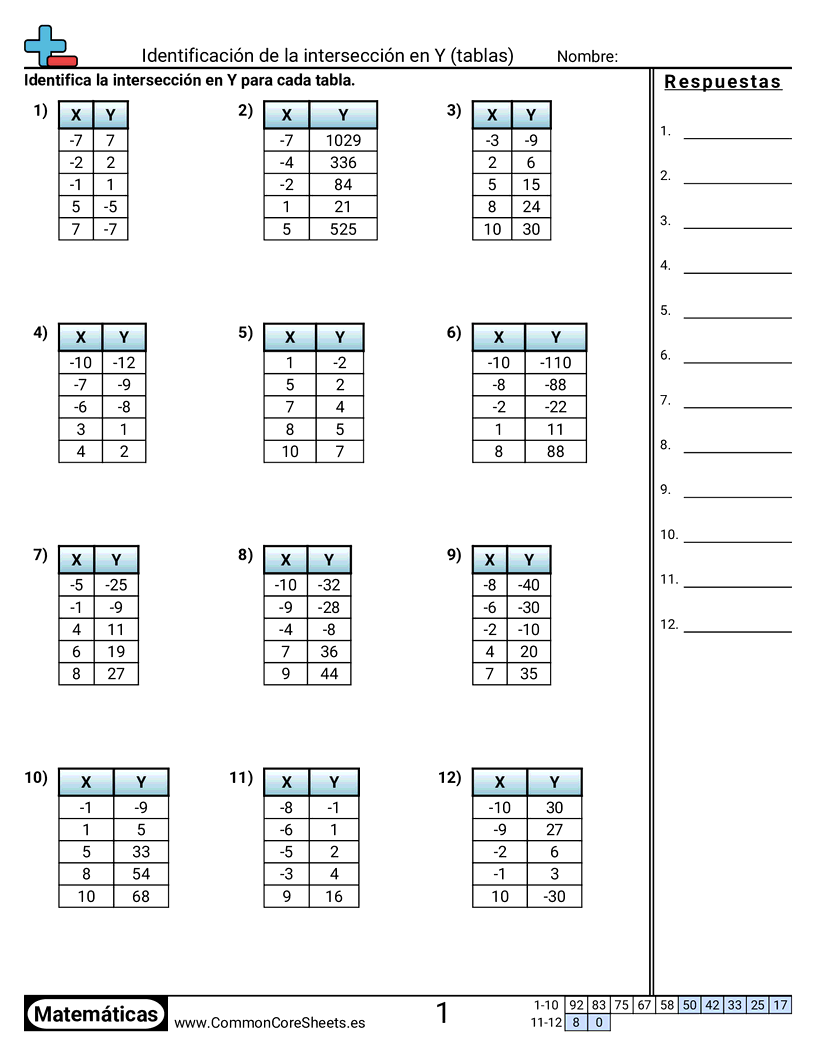 Hojas de trabajo gratis de math para 8vo Grado (8f2) sobre Identificación de la intersección en Y (tablas). Cada hoja tiene 12 ejercicios con hoja de respuestas y es ideal para maestros y educación en casa. Puedes descargar el PDF, crear tarjetas de memoria o configurarlo para aprendizaje en línea.