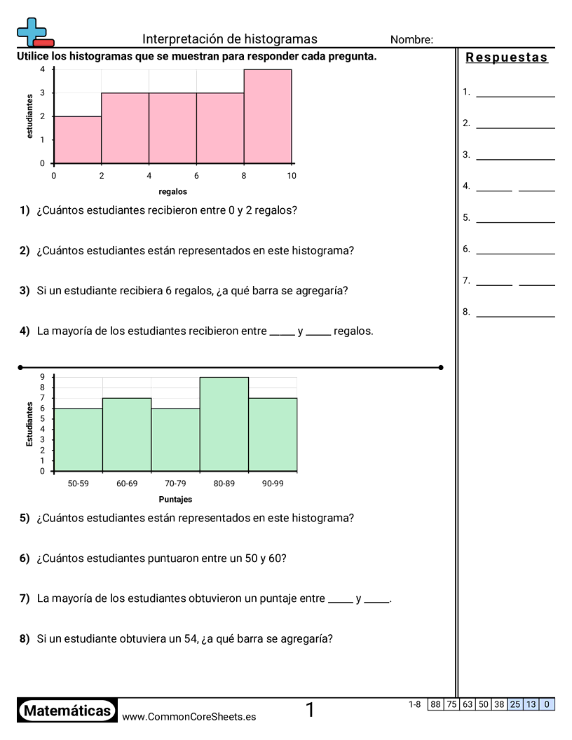 Hojas de trabajo gratis de math sobre Interpretación de histogramas. Cada hoja tiene 8 ejercicios con hoja de respuestas y es ideal para maestros y educación en casa. Puedes descargar el PDF, crear tarjetas de memoria o configurarlo para aprendizaje en línea.