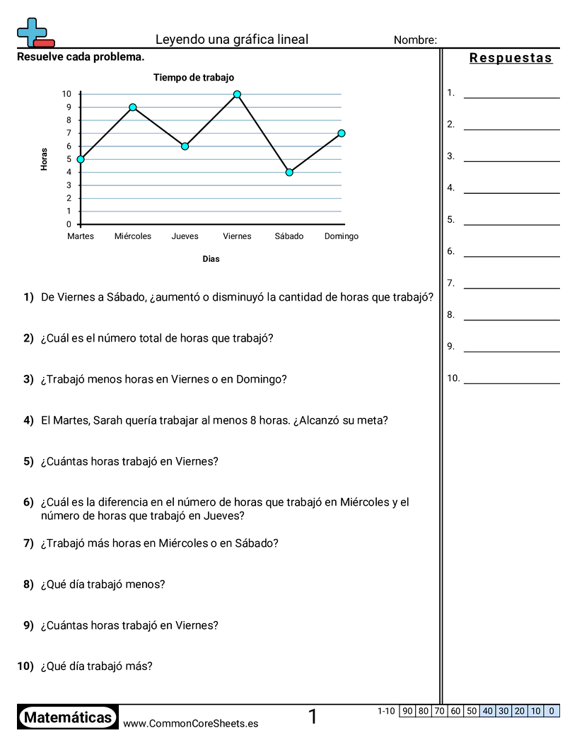Hojas de trabajo gratis de math sobre Leyendo una gráfica lineal. Cada hoja tiene 10 ejercicios con hoja de respuestas y es ideal para maestros y educación en casa. Puedes descargar el PDF, crear tarjetas de memoria o configurarlo para aprendizaje en línea.