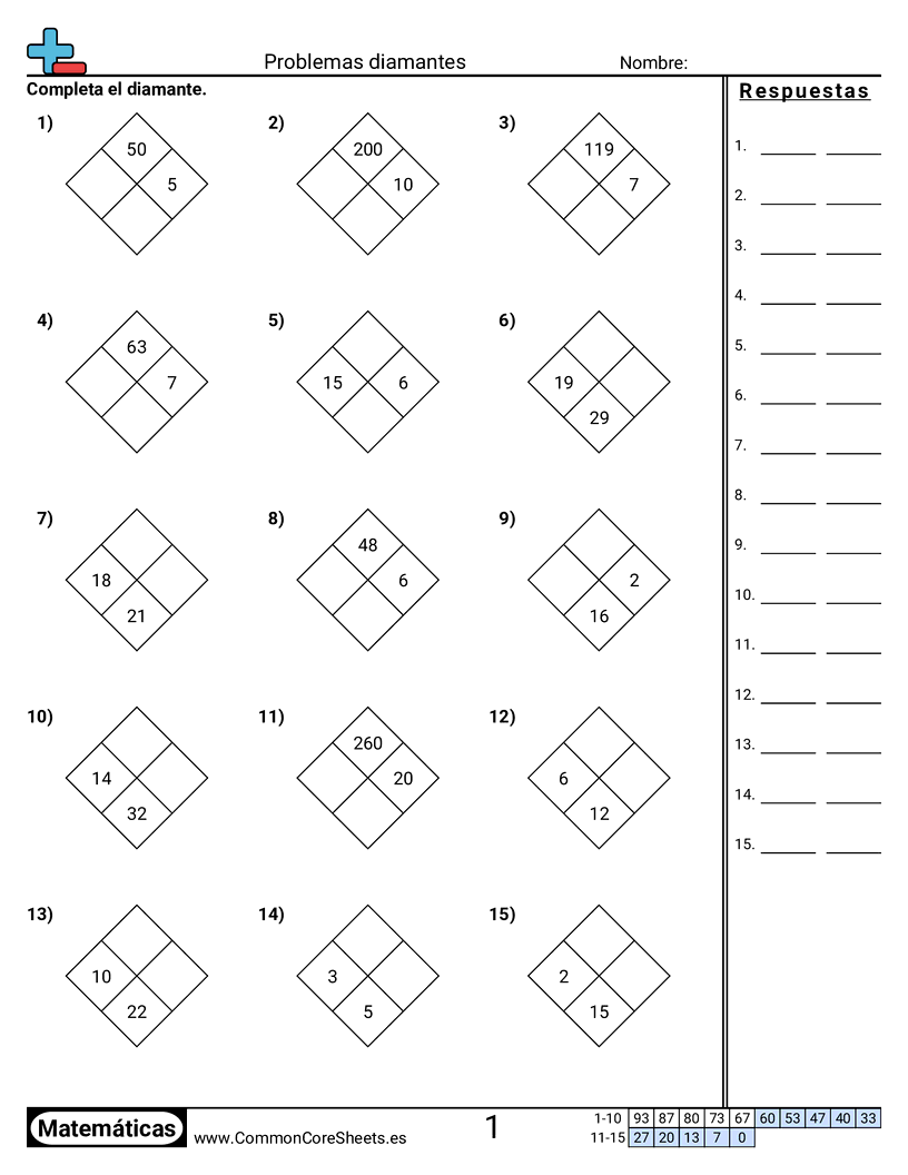 Hojas de trabajo gratis de math sobre Problemas diamantes. Cada hoja tiene 15 ejercicios con hoja de respuestas y es ideal para maestros y educación en casa. Puedes descargar el PDF, crear tarjetas de memoria o configurarlo para aprendizaje en línea.