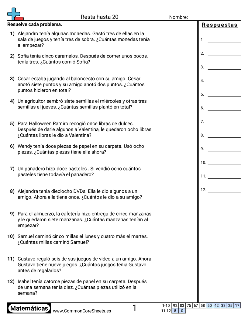 Hojas de trabajo gratis de math para 1er Grado (1oa1) sobre Resta hasta 20. Cada hoja tiene 12 ejercicios con hoja de respuestas y es ideal para maestros y educación en casa. Puedes descargar el PDF, crear tarjetas de memoria o configurarlo para aprendizaje en línea.