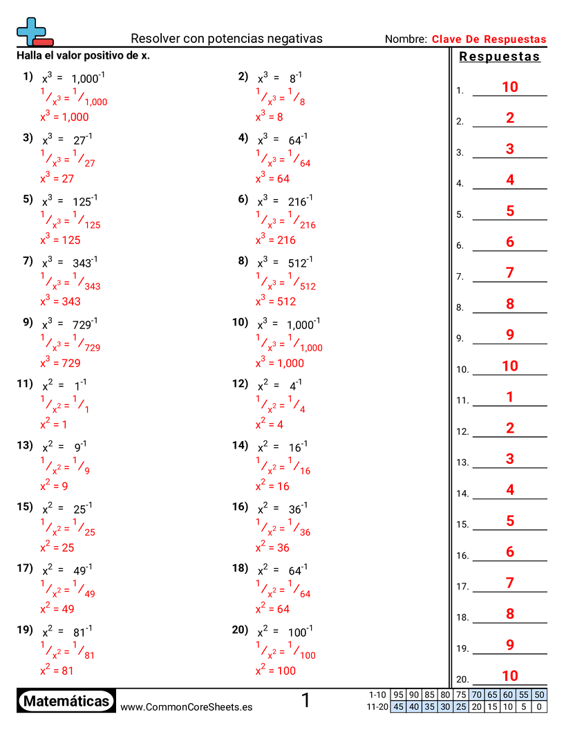 Hojas de trabajo gratis de math para 8vo Grado (8ns2) sobre Resolver con potencias negativas. Cada hoja tiene 20 ejercicios con hoja de respuestas y es ideal para maestros y educación en casa. Puedes descargar el PDF, crear tarjetas de memoria o configurarlo para aprendizaje en línea.