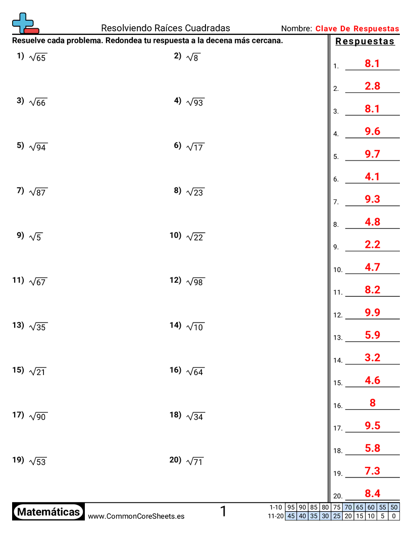 Cada hoja tiene 20 problemas para encontrar la raíz cuadrada de un número.