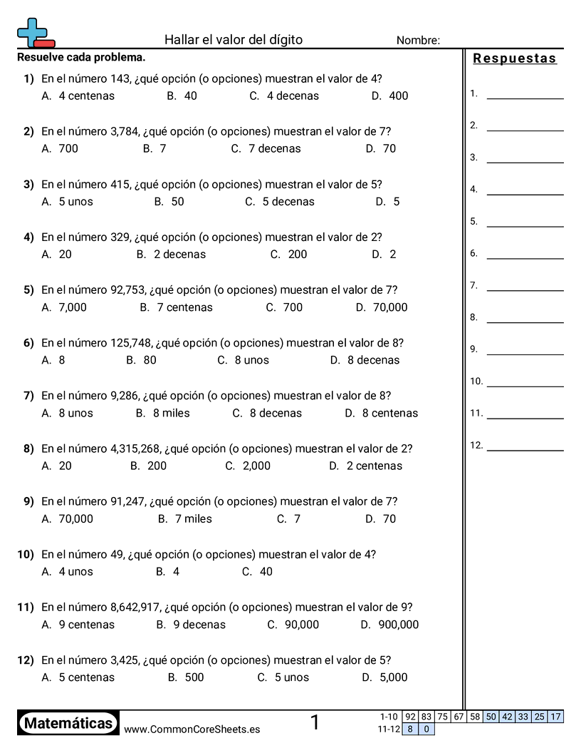 Hojas de trabajo gratis de math sobre Hallar el valor del dígito. Cada hoja tiene 12 ejercicios con hoja de respuestas y es ideal para maestros y educación en casa. Puedes descargar el PDF, crear tarjetas de memoria o configurarlo para aprendizaje en línea.
