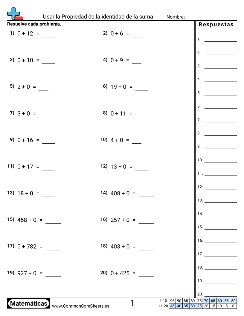Hojas de trabajo gratis de math sobre Usar la Propiedad de la identidad de la suma. Cada hoja tiene 20 ejercicios con hoja de respuestas y es ideal para maestros y educación en casa. Puedes descargar el PDF, crear tarjetas de memoria o configurarlo para aprendizaje en línea.