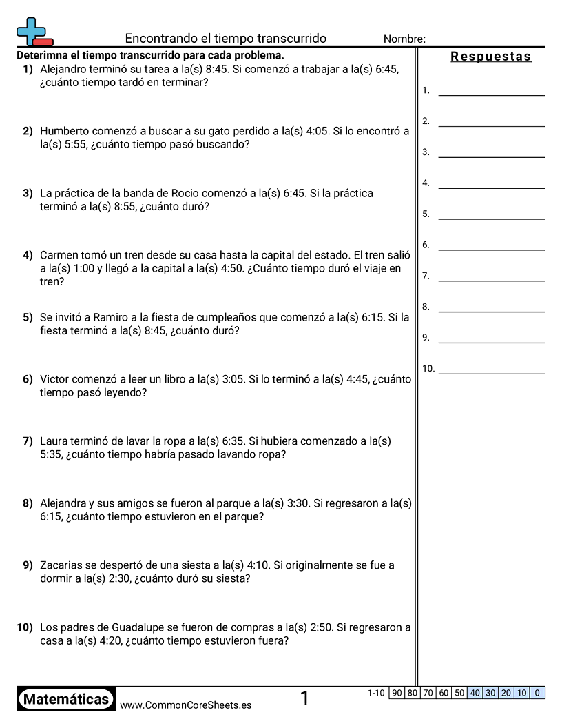 Hojas de trabajo gratis de math para 3er Grado (3md1) sobre Encontrando el tiempo transcurrido. Cada hoja tiene 10 ejercicios con hoja de respuestas y es ideal para maestros y educación en casa. Puedes descargar el PDF, crear tarjetas de memoria o configurarlo para aprendizaje en línea.