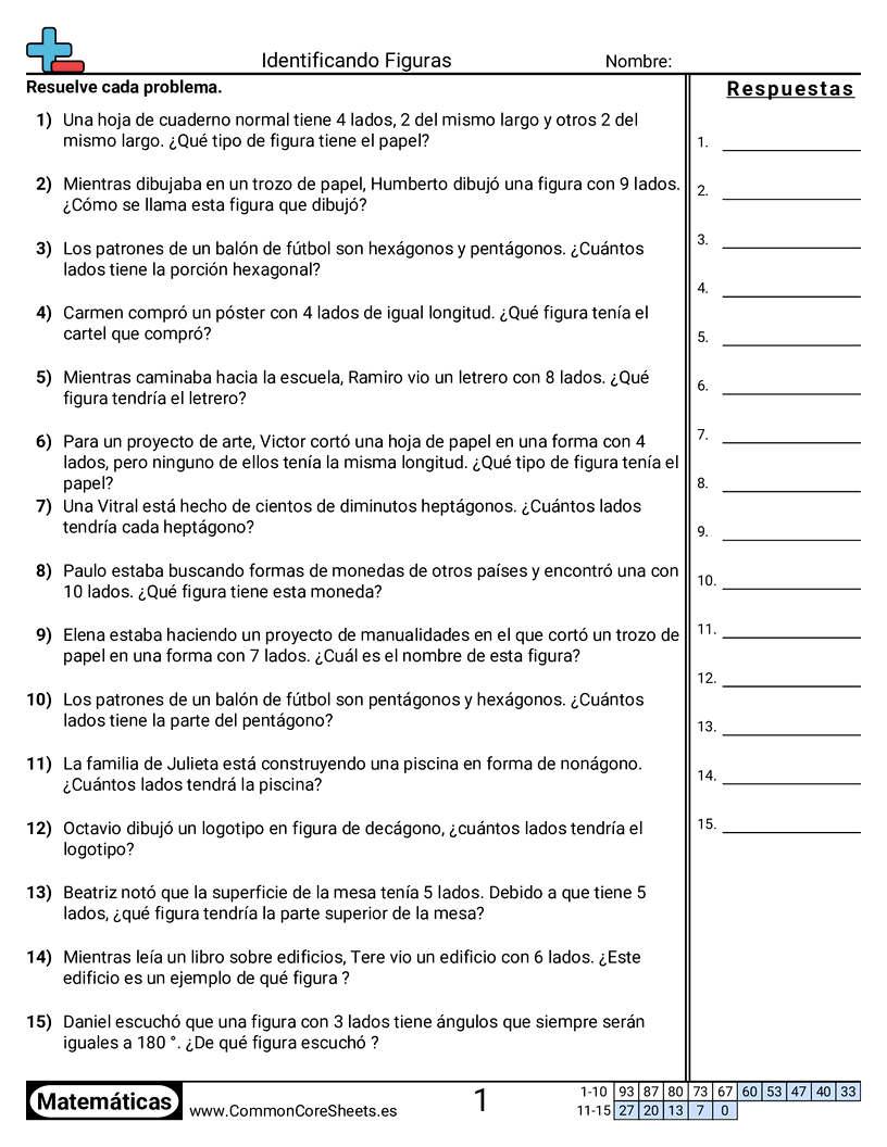 Hojas de trabajo gratis de math para 3er Grado (3g1) sobre Identificando Figuras. Cada hoja tiene 15 ejercicios con hoja de respuestas y es ideal para maestros y educación en casa. Puedes descargar el PDF, crear tarjetas de memoria o configurarlo para aprendizaje en línea.