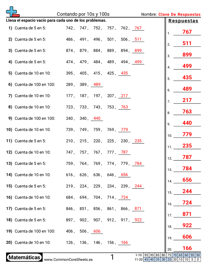 Hojas de trabajo gratis de math para 2do Grado (2nbt2) sobre Contando por 10s y 100s. Cada hoja tiene 20 ejercicios con hoja de respuestas y es ideal para maestros y educación en casa. Puedes descargar el PDF, crear tarjetas de memoria o configurarlo para aprendizaje en línea.